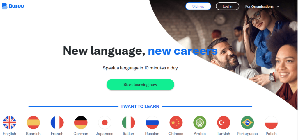 Busuu هو أكبر مجتمع في العالم لتعلم اللغات ، حيث يقدم دورات في 12 لغة مختلفة على الويب والجوال لأكثر من 100 مليون متعلم في جميع أنحاء العالم. يمكن للمتعلمين الاشتراك مجانًا أو الاشتراك في عضوية Premium لفتح المزيد من الميزات مثل دروس القواعد المتقدمة أو وضع عدم الاتصال أو شهادة McGraw-Hill Education أو مدرب المفردات التكيفي الخاص بنا .